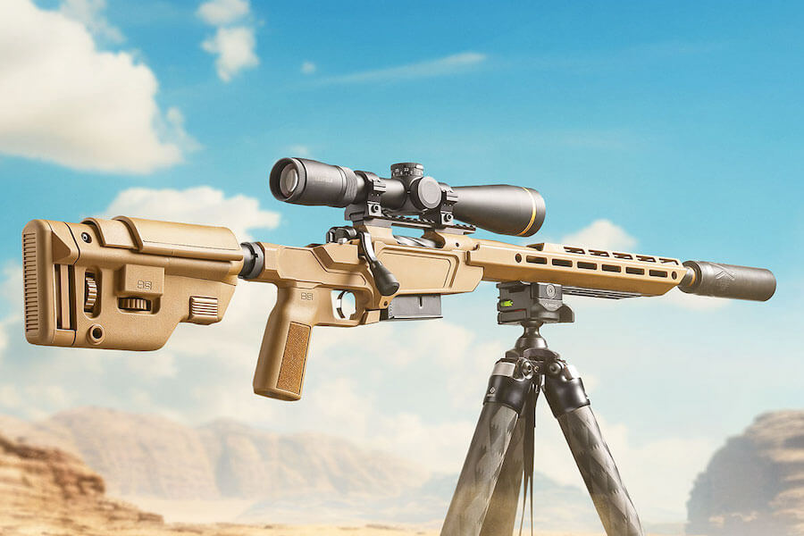 Chassis precision rifle with .75 MOA guarantee, collapsible stock, Triggertech trigger.